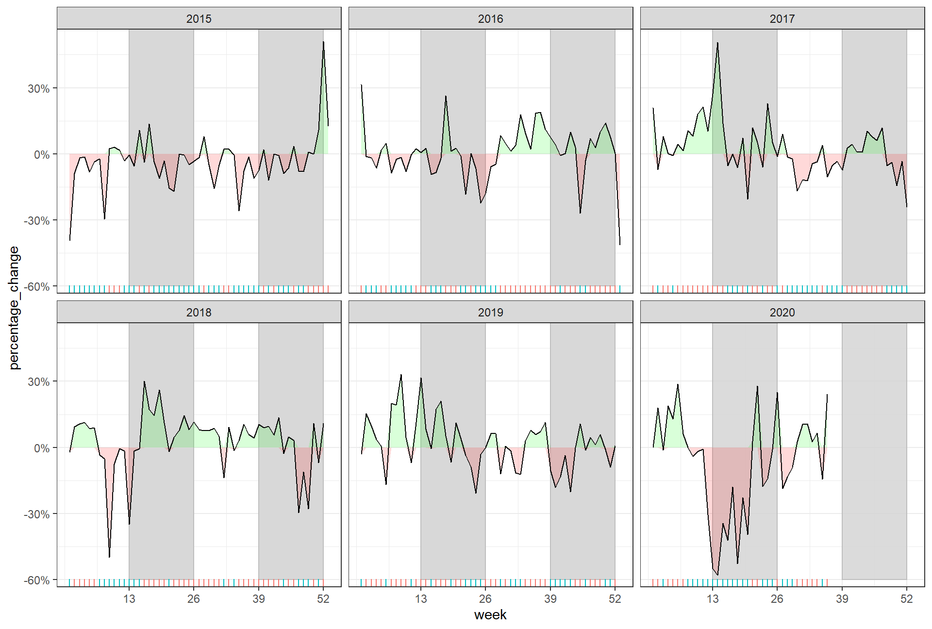 The second one looks at percentage changes from the expected level of weekly rentals. The two grey shaded rectangles correspond to the second (weeks 14-26) and fourth (weeks 40-52) quarters.